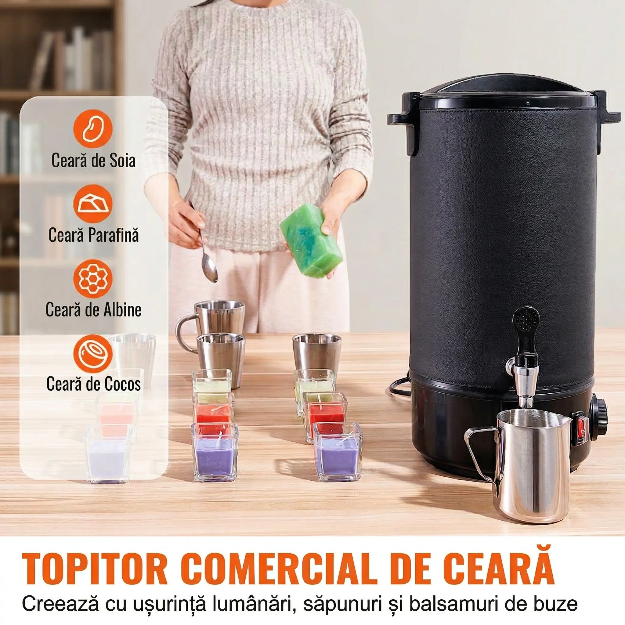 Cu o capacitate de 10L, acest aparat este ideal pentru mici afaceri, pasionați DIY și producție mare. Pe lângă lumânări, se poate folosi pentru săpun, cosmetice sau balsam de buze.